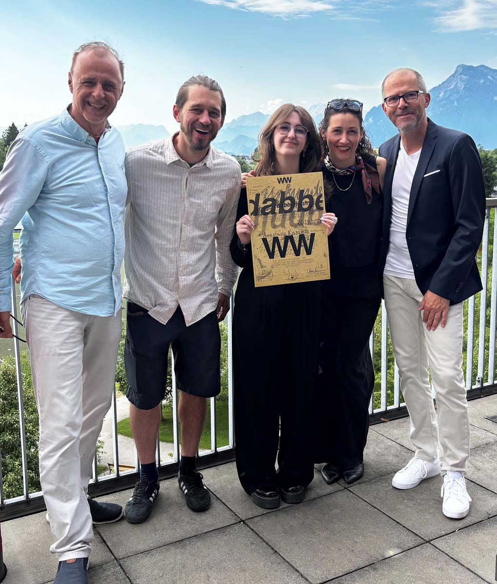 Der von den Altlieferingern gestiftete dabbelJUUH-Kunstpreis ging heuer an Anastasia KAZAMIA (Bild Mitte). Die frisch gebackene Maturantin der Klasse MJ25nb wusste durch ihre beherzte, hingebungsvolle und konsequente Zeichenkunst zu begeistern, wovon bereits die Ausstellung „Tinte & Öl“ in der KHG Salzburg und ihre ABA zeugten.