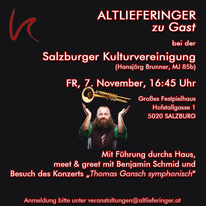 Unser nächstes ALTLIEFERINGER zu Gast führt uns am 7. November, ab 16:45, in und hinter die Kulissen des Großen Festspielhauses. MMag. Dr. Hansjörg Brunner (MJ 85b) lädt als frisch gebackener Präsident der Salzburger Kulturvereinigung zur Hausführung, zum meet & greet mit Benjamin Schmid, dem neuen künstlerischen Leiter der Kulturvereinigung, und anschließend zum Konzert des „Headmasters“ des weithin populären Blechblasensembles Mnozil Brass „Thomas Gansch symphonisch“ ein. Ein Highlight steht uns bevor und wir bitten um baldige Anmeldung unter Diese E-Mail-Adresse ist vor Spambots geschützt! Zur Anzeige muss JavaScript eingeschaltet sein!.