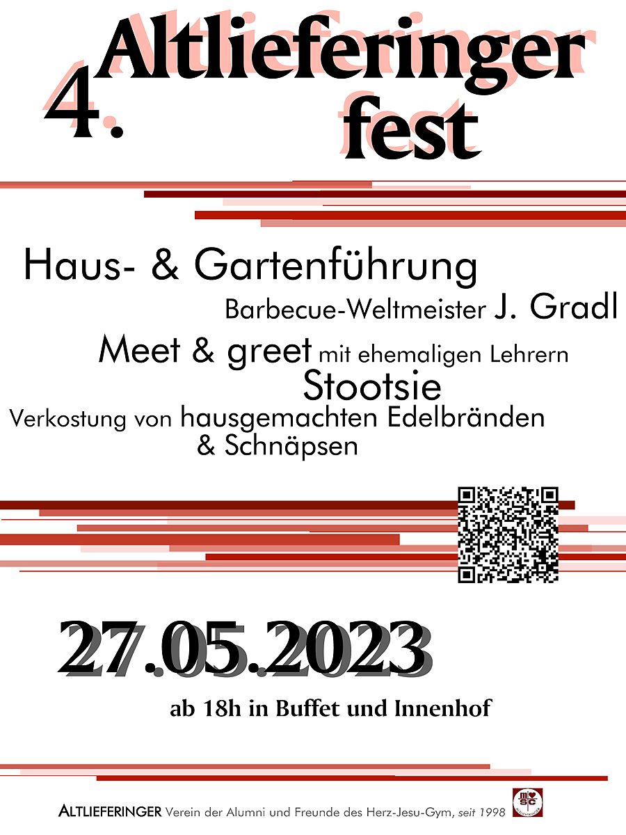 Schon bald, am 27. Mai, stehen die heurige Jahreshauptversammlung (16h30) und das Altlieferingerfest (ab 18h im Buffet) auf dem Programm! Dazu sind natürlich alle Altlieferinger sehr herzlich eingeladen um Wiedersehen mit alten Kollegen, Lehrerinnen und Lehrern und ihrer langjährigen Wirkungsstätte zu feiern! Für Führungen durch Haus und Garten ist natürlich genauso gesorgt wie für Speis und Trank. Stootsie wird den Abend zusätzlich musikalisch versüßen!