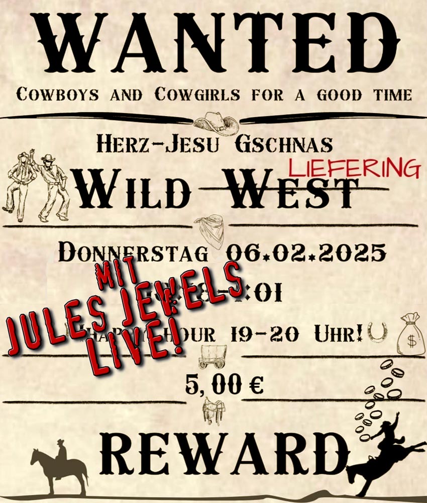 Bald ist es wieder so weit! Das Schulgschnas lockt am DO, 6. Februar, Cowgirls & -boys und alle anderen zum Faschingsfest! Unter dem Motto „Wild West Liefering“ tauchen Schüler:innen, Lehrer:nnen, Eltern und Altlieferinger ins ausgelassene Gschnas-Treiben! Good Time ist garantiert, denn für die musikalische Umrahmung sorgt die Altlieferinger-Combo JULES JEWELS mit Stootsie und Musikanten der bereits legendären MSC Big Band! Dazu gibt’s Western-Disco, Tombola und „Schmidlechner-Pizza“! Es darf gelacht, gefeiert und getanzt werden!