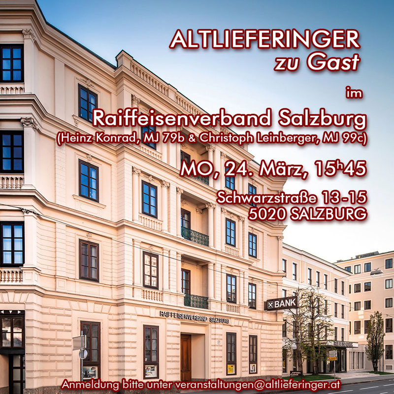 Es ist wieder soweit: Wir setzen unsere Reihe ALTLIEFERINGER zu Gast fort und freuen uns am 24. März, ab 15:45, Gast in der Zentrale des Raiffeisenverbands Salzburg in der Schwarzstraße sein zu dürfen. Dort empfangen uns Heinz Konrad (MJ 79b) und Christoph Leinberger (MJ 99c) um uns neben der Schalterhalle und der Safeanlage auch Einblicke in ihre verschiedenen Tätigkeitsfelder (von „private banking“ bis „Genossenschaft“) zu bieten. Und freilich wird auch der gemütliche Austausch nicht zu kurz kommen …