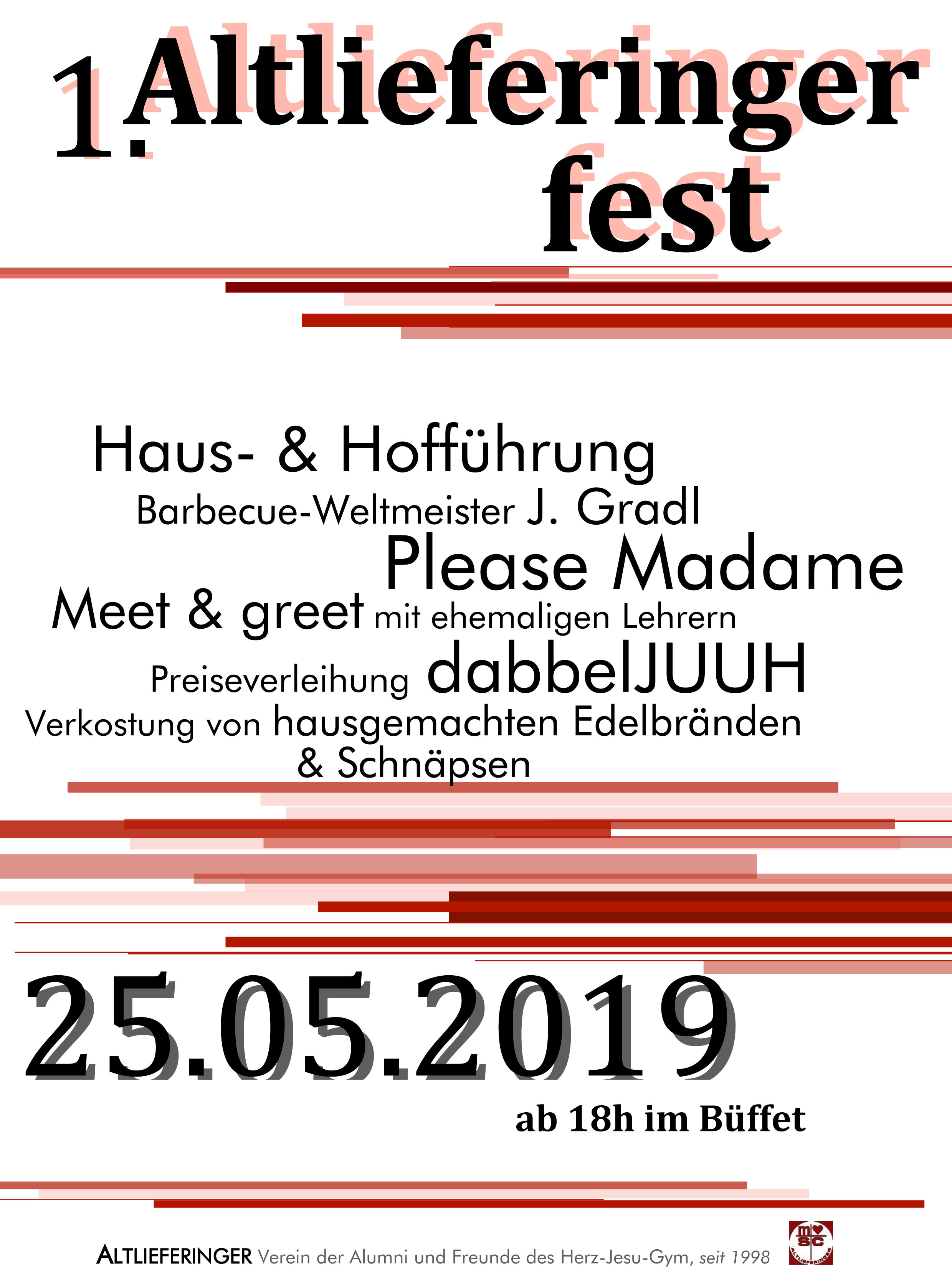 Endlich ist es da! Am 25. Mai 2019 steigt ab 18h im Buffet unser 1. Altlieferingerfest! Dazu sind alle ehemaligen Schüler, Lehrer und Freunde des Herz-Jesu-Gym herzlich eingeladen! Neben der kulinarischen Betreuung durch Grillweltmeister Josef Gradl sollen alle Gäste das bunte Programm – Please Madame, dabbelJUUH-Preis-Verleihung, Rückblicke in Bild und Ton – und einen gemütlichen Rahmen genießen, um einander und die alte Wirkungsstätte wieder zu sehen. Vor dem Fest findet ab 16h30 die Generalversammlung der Vereinsmitglieder im Theatersaal statt. Wir freuen uns auf Euer Kommen!