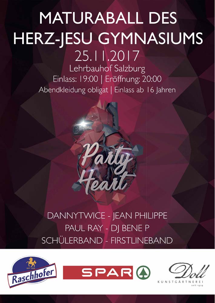 Nach drei Jahren ist es endlich wieder so weit: Unter dem Motto "Party Heart" findet der 26. HERZ-JESU-BALL am 25.11.2017 im Lehrbauhof, Moosstraße 197, statt.